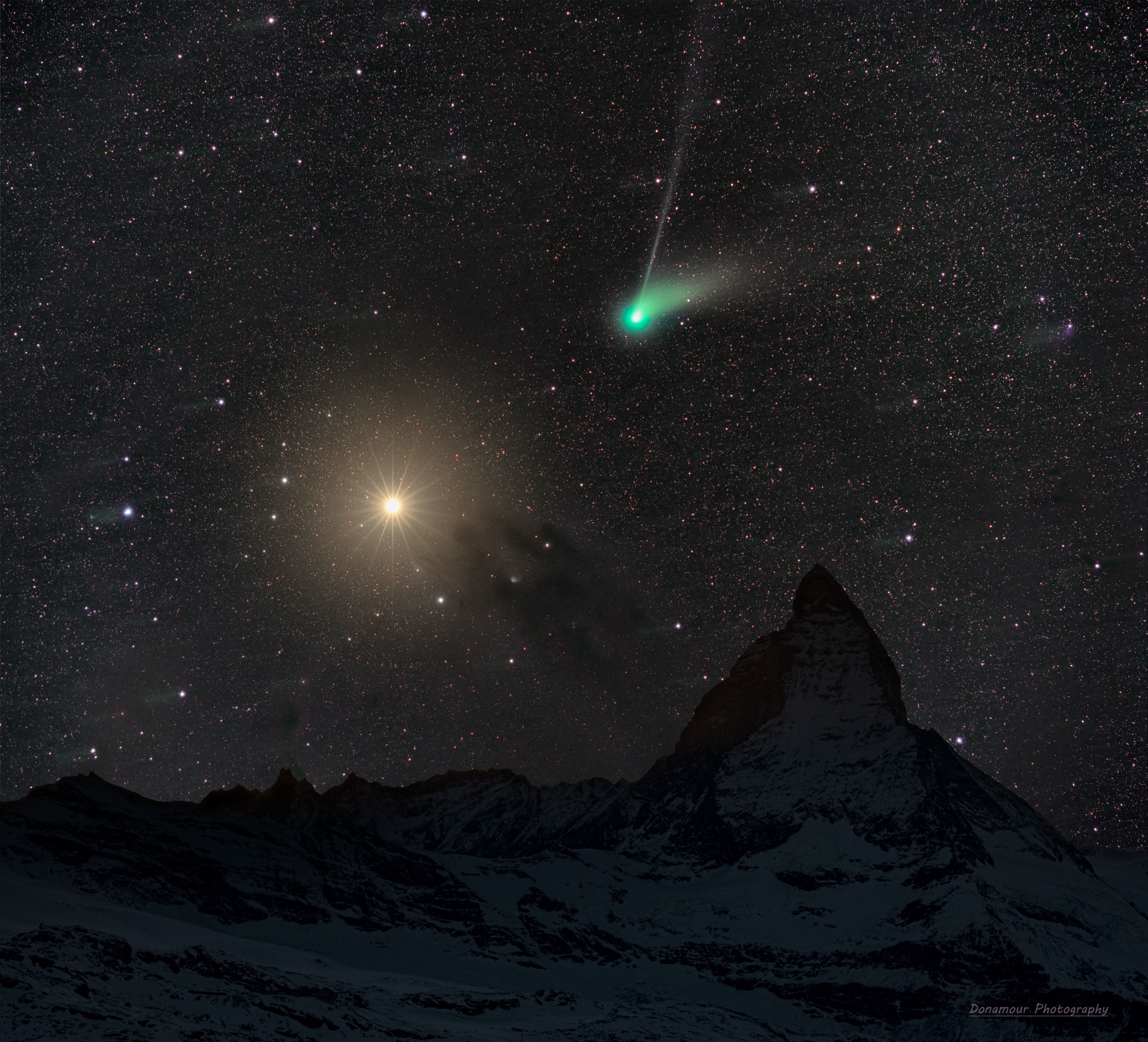 아니, ZTF 혜성은 화성에 충돌하지 않을 거야. 밝은 녹색의 혼수상태 때문에 녹색 혜성이라는 별명을 가진 C/2022 E3 (ZTF)는 며칠 전에 훨씬 더 먼 행성의 거의 앞을 지나갔고, 이는 특집 사진이 찍혔을 때와 거의 때가 가까웠다. 이 두 개의 하늘 아이콘은 유명한 지구의 아이콘 뒤에서 포착되었습니다. 그림 같은 봉우리를 가진 이탈리아 알프스의 산인 마테호른입니다. 전경과 배경 이미지 모두 같은 저녁에 같은 카메라와 같은 위치에서 촬영되었다. 이 혜성의 흰 먼지 꼬리는 녹색 코마의 오른쪽에서 볼 수 있고, 연한 파란색 이온 꼬리는 이미지의 맨 위를 향해 나아간다. 오렌지색 화성은 수많은 배경별들과 그 오른쪽 아래에 있는 어두운 성운 바너드 22 앞에 있다. 비록 화성은 앞으로 몇 달 동안 저녁 하늘에서 볼 수 있지만, ZTF 혜성은 태양계 바깥쪽으로 돌아오면서 이미 희미해지기 시작했다. 혜성 ZTF 갤러리: APOD에 주목할 만한 출품작