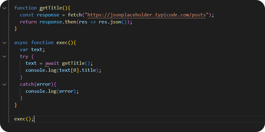 getTitle 함수는 fetch를 통해 호출한 API로부터 응답 데이터 받고 JSON 파싱하여 리턴하는 부분만 담당합니다. 그리고 그 데이터를 받아서 처리하는 함수가 exec 입니다.