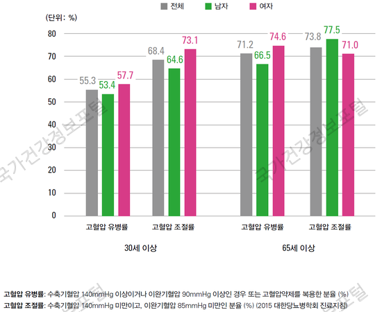 65세 이상에서는 당뇨병 유병자의 10명 중 7명이 고혈압을 동반하였습니다.